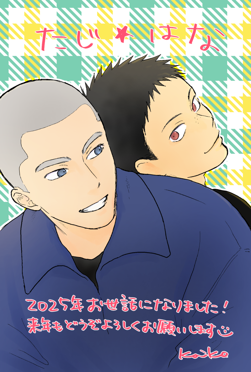 花井の背中に寄りかかる田島。お互いの顔に視線を向けて笑っている。 画像上部に「たじ⭐︎はな」、画像下部に「2025年おせわになりました!来年もどうぞよろしくお願いします」と文字が入っている。 口を尖らせた田島と目を見張った花井が向かい合って目を合わせている ピンクのつなぎを着た花井と、黄色のつなぎを着た田島。花井は両拳を頬に当てて立ち、田島は手のひらを上に、両肘を曲げて外側に向けて広げ、上体を立たせた状態でしゃがんでいる。 田島のバストアップイラスト。青い服を着ており、歯を見せて微笑んでいる。